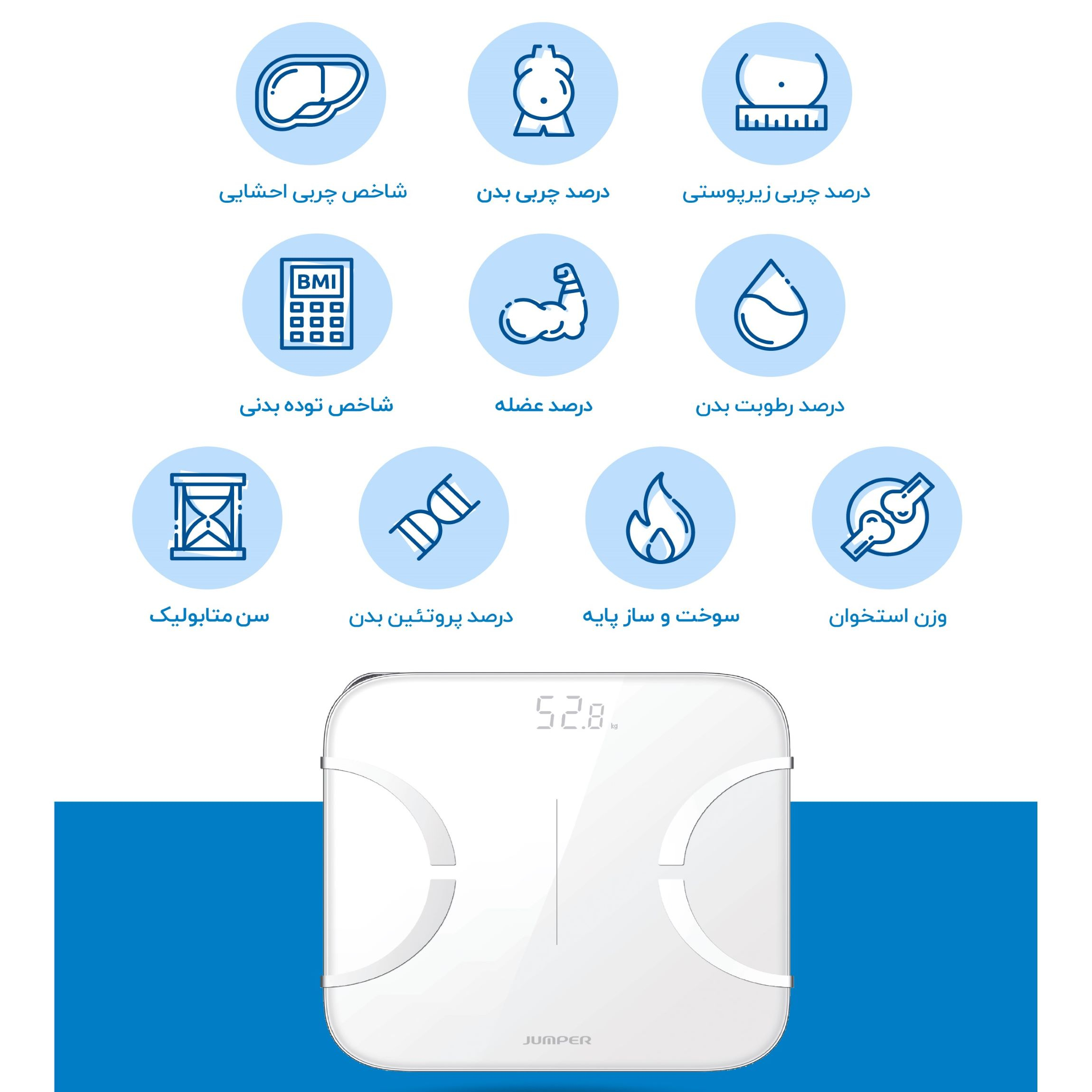 ترازوی هوشمند Jumper مدل JPD-200B دقیق، زیبا و مدرن و از جدیدترین ترازوهای کمپانی جامپر مدیکال است که کمک شایانی به افراد در مسیر رسیدن به سلامتی و تناسب اندام میکند. این ترازو با اندازهگیری شاخصهای آنالیز بدن شامل درصد عضله، درصد رطوبت بدن، وزن استخوانها، میزان سوخت و ساز پایه، شاخص چربی احشایی، سن بیولوژیک، میزان چربی بدن، میزان پروتئین بدن، شاخص تودهی بدنیBMI ، درصد چربی زیر پوستی، و وزن یکی از کامل ترین ترازوهای موجود در ایران است. این ترازوی آنالیز بدن با استفاده از بلوتوث این شاخصهای اندازهگیری شده را به اپلیکیشن موبایل(هم اندروید هم IOS ) ارسال میکند. اپلیکیشن فارسی سیناکِر و نیز اپلیکیشن Jumper Health با این ترازو همگام بوده و با ذخیره نتایج و تحلیل وضعیت سلامتی به کاربر کمک میکنند.