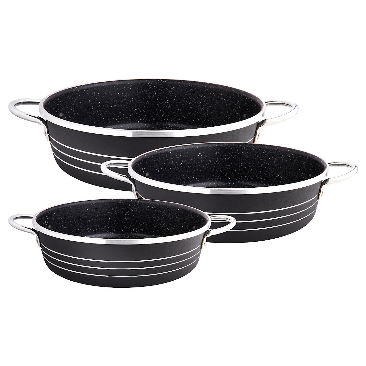 سرویس تابه ۳ پارچه مدل گلدانی شامل ۳ عدد تابه بدون درب در سایز های ۱۸ و ۲۲ و ۲۸ می باشد که از مرغوب ترین مواد اولیه و گرانیت سه لایه تهیه شده است و جنس دسته های این محصول فلزی و نقره ای رنگ می باشد