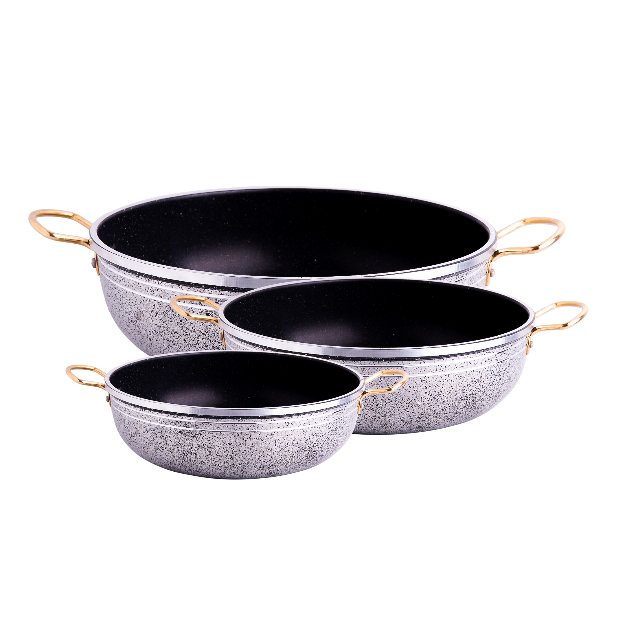 سرویس ماهیتابه سه پارچه مدل 022 شامل سه عدد ماهیتابه طرح چدن با سایز های 18 و 22 و 28 میباشد. جنس بدنه از آلومینیوم و روکش داخلی از جنس گرانیت میباشد