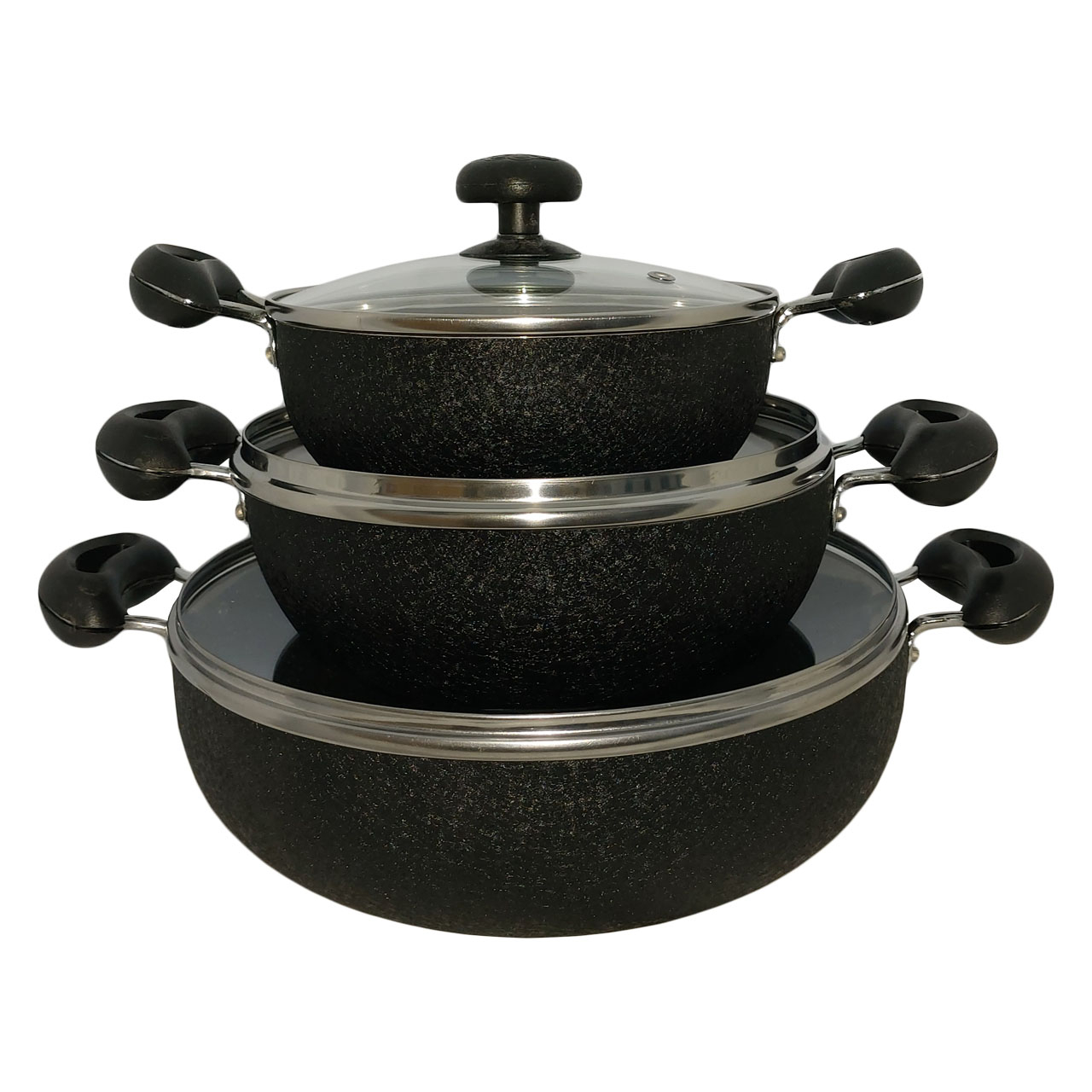 برای پختن غذا اولین نکته‌ای که باید به آن توجه شود، استفاده از مواد اولیه استاندارد و طبیعی است. دومین نکته هم ظروفی است که برای آشپزی به‌ کار می‌گیرید. قطعا باید ظروفی انتخاب کنید که در کنار زیبایی، از کیفیت غذای شما نکاهند. این محصول ساخته‌ شده از آلومینیوم بوده و روکشی گرانیتی دارد و در رنگ‌های متنوعی طراحی شده است. این مدل با بدنه و کفی ضخیمی که دارد، حرارت را به‌ صورت یکسان به تمام نقاط منتقل می‌کند و پختی یکدست خواهید داشت. سایزهای استاندارد و پرکاربرد 28 سانتی متر، 22 سانتی متر و 18 سانتی متر تابه ها در کنار دوام و عمر طولانی آن، این محصول را به یکی از پرکاربردترین محصولات در آشپزخانه تبدیل کرده است. هر کدام از تابه های این محصول دارای 2 دستگیره از جنس عایق میبیاشد که باعث تسلط بیشتر در زمان پخت و جابجایی میشود. این ست در سایز ها و رنگبندی مختلف می باشد که به راحتی با هر آشپزخانه ای ست شده و آشپزی را برای شما آسان نموده. همچنین شستشوی آن آسان است و با یک اسفنج نرم نیز به راحتی تمیز می‌شود. سرخ کردن انواع مواد غذایی در این محصول نیازی به روغن فراوان ندارد و با کمترین میزان روغن هم می‌توان به غذایی ترد و مغز پخت دست یافت. در صورت نیاز می‌توان برای شست‌وشو آن را در ماشین ظرف‌شویی قرار داد.