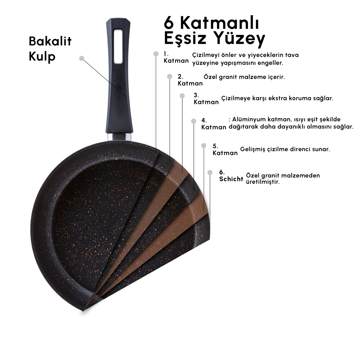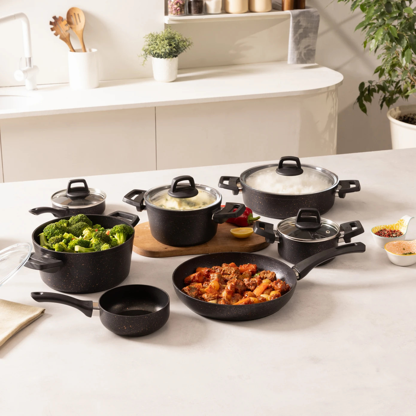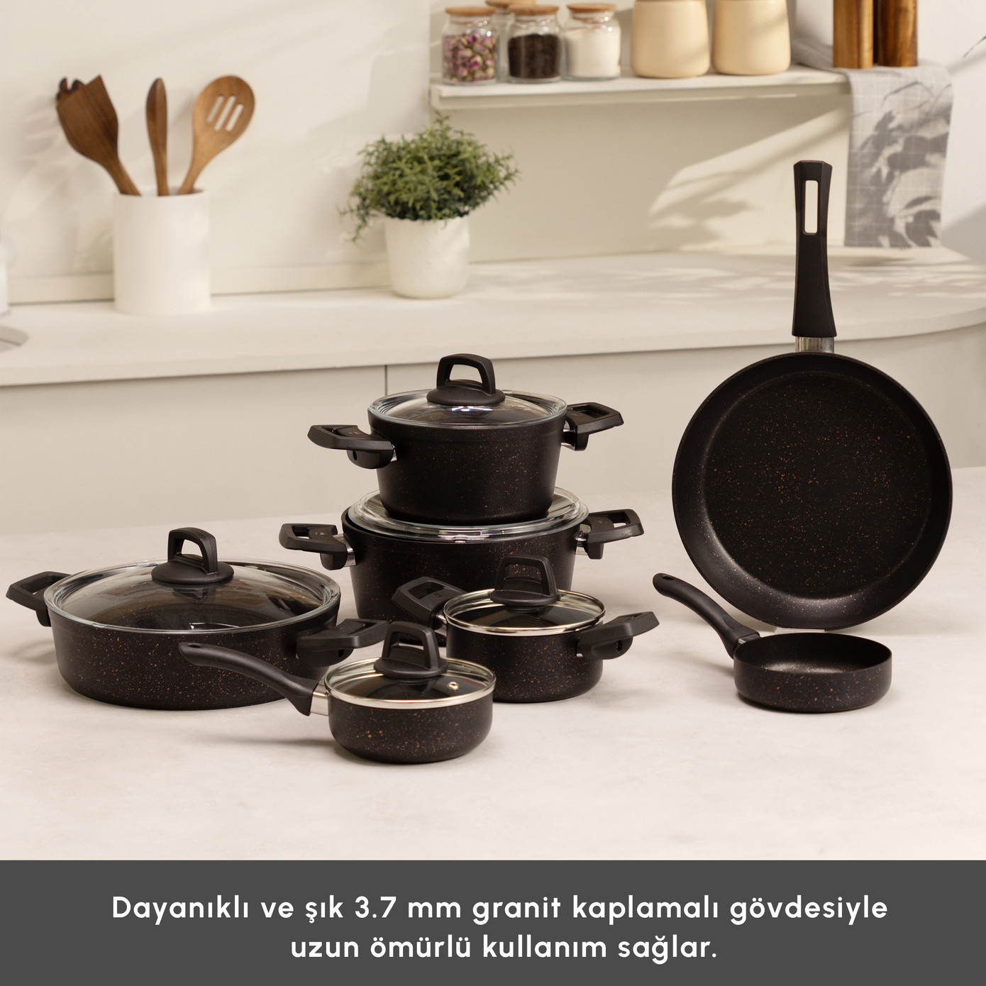 سرویس قابلمه 12 پارچه کاراجا **Biogranit Blackgold** با جنس بایوگرانیت، بهترین انتخاب برای آشپزخانههای مدرن و حرفهای است. این سرویس شامل یک عدد قابلمه عمیق قطر 18 سانتی متر همراه درب،یک عدد قابلمه عمیق قطر 22 سانتی متر همراه درب،یک عدد نیم قابلمه قطر 26 سانتی متر همراه درب ، یک عدد تابه قطر 26 سانتی متر ،یک عدد تابه قطر 14 سانتی متر ،دو عدد قابلمه 14 سانتی به همراه دو عدد درب است که تمامی نیازهای پخت و پز را به خوبی پوشش میدهد. با ضخامت 4 میلیمتر و پوشش گرانیتی داخلی و بیرونی، این سرویس از مقاومت بالایی برخوردار بوده و به دلیل ضد چسبندگی، ضد سوختگی و لکهنداشتن، تمیز کردن آن بسیار آسان است. دستگیرههای شیک و گرمایش یکنواخت، زمان و انرژی مصرفی را کاهش داده و فرآیند پخت را سادهتر میکند. درب شیشهای مقاوم به حرارت، امکان نظارت بر فرآیند پخت را فراهم میکند و قابلیت شستشو در ماشین ظرفشویی، نگهداری از این سرویس را آسان میکند. این سرویس به دلیل ویژگیهای منحصر به فرد، در برابر خط و خش تا **7 برابر مقاومتر از محصولات مشابه** است. همچنین، ماده اولیه گرانیتی استفاده شده در تولید این محصول، از **سوئیس** وارد شده و تحت برند کاراجا در سراسر دنیا عرضه میشود. با تولید در کشور ترکیه و گواهیهای کیفیت، این سرویس یکی از بهترین گزینههای موجود در بازار است که به دلیل طراحی زیبا، کیفیت بالا و امنیت در استفاده، انتخابی عالی برای هر خانوادهای است.
