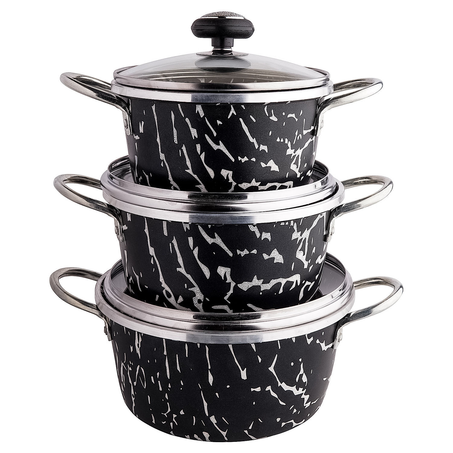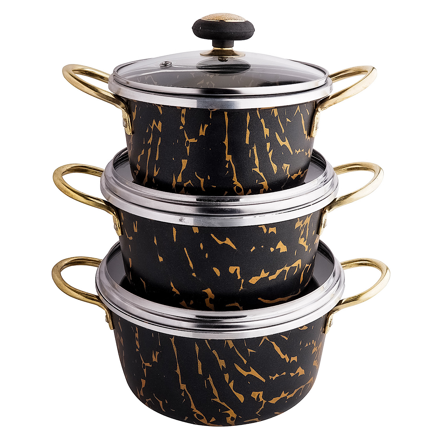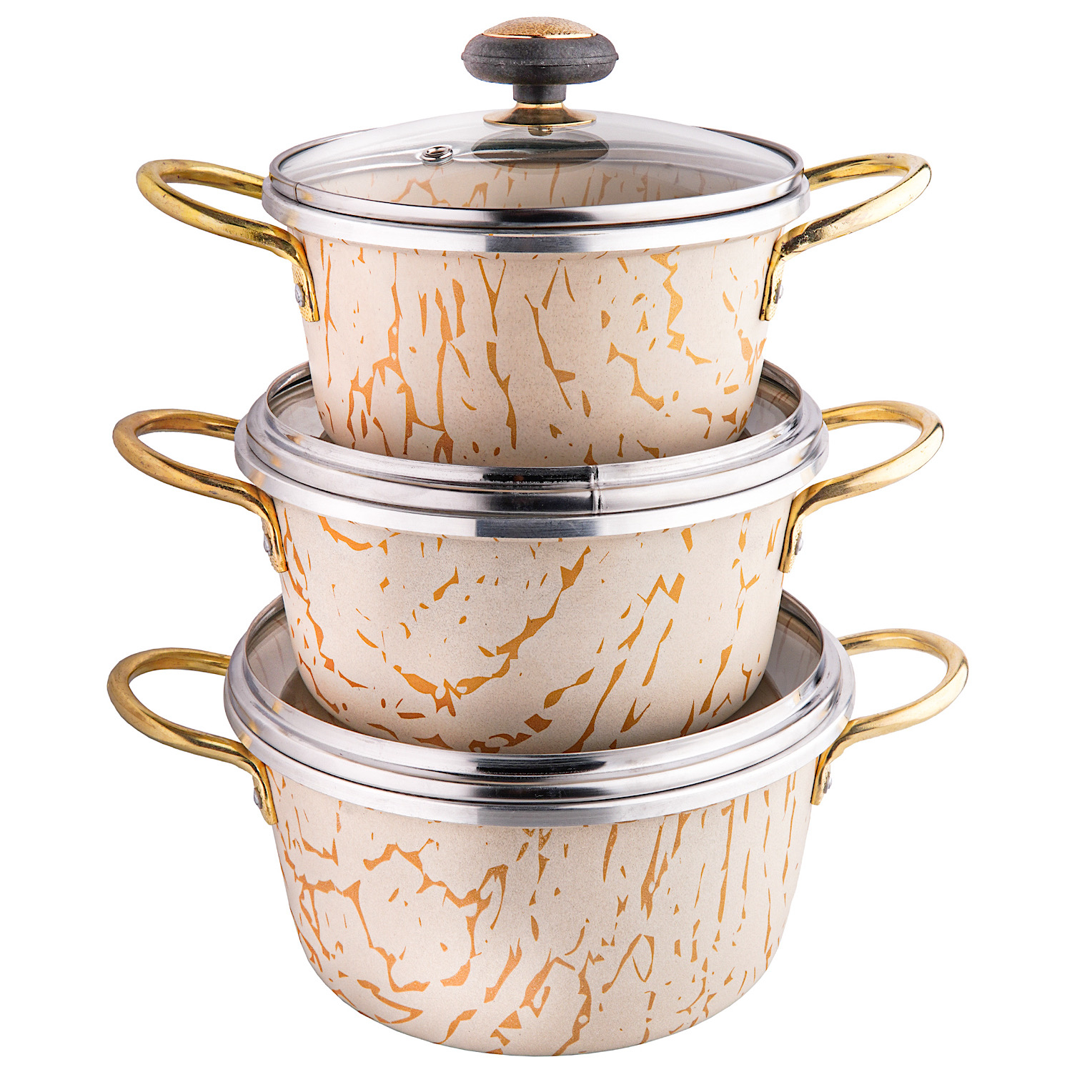 سرویس قابلمه مدل ماربل گلدانی شامل سه عدد قابلمه در سایز های ۱۶ و ۱۸ و ۲۰ همراه با درب پیرکس می باشد که دارای دسته های فلزی و پوشش داخلی و بیرونی گرانیت آن از جنس گرانیت سه لایه می باشد