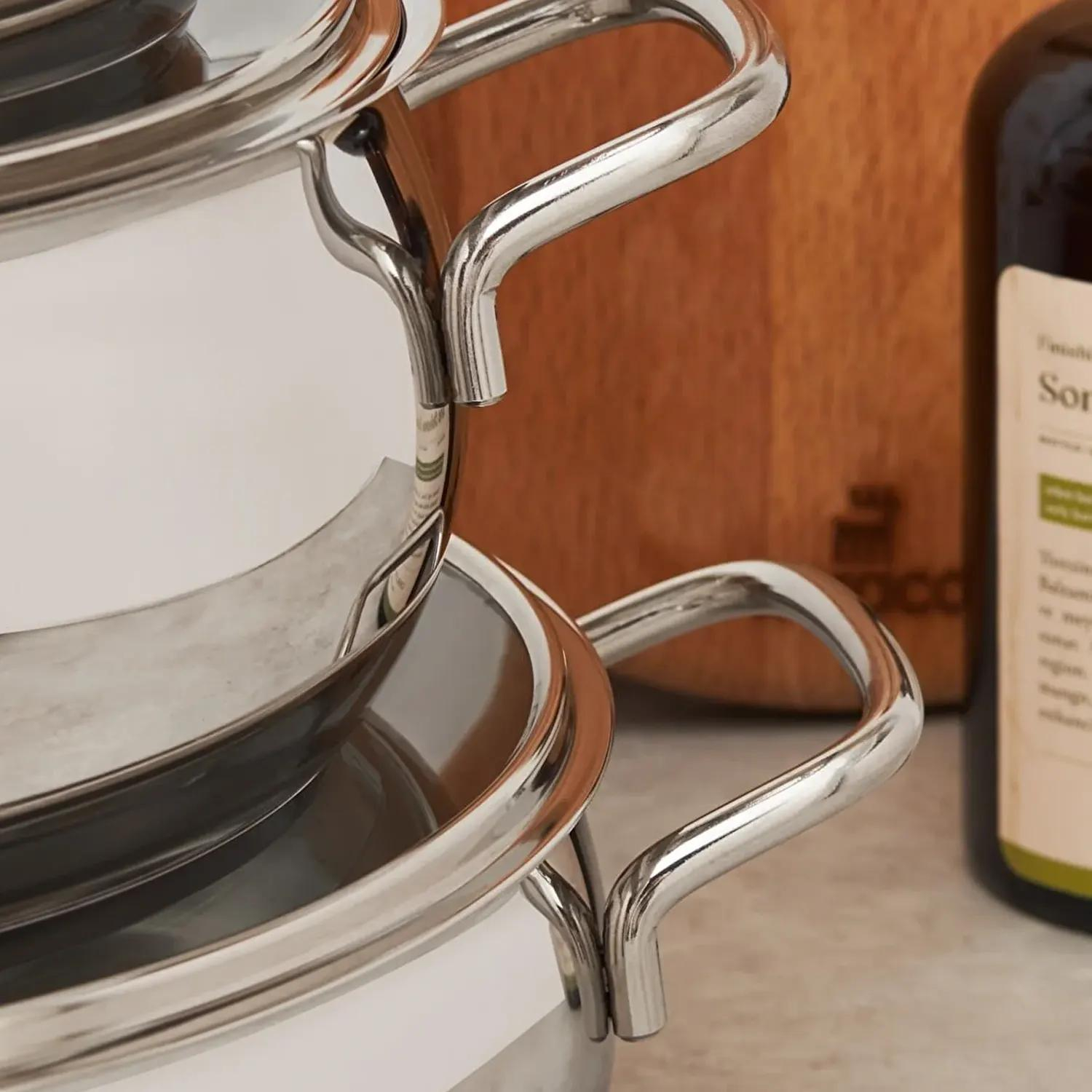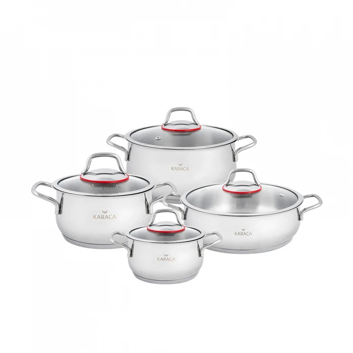 سرویس قابلمه 8 پارچه کاراجا مدل Emirgan محصولی باکیفیت و بادوام از کشور ترکیه است که برای آشپزی حرفهای و روزمره طراحی شده است. ساختار بدنه و جنس روکش داخلی این سرویس به صورت کامل از استیل ساخته شده که دوام بالای آن را تضمین میکند. دستههای این سرویس نیز از جنس استیل بوده و به صورت پرچ شده به بدنه متصل شدهاند تا استحکام بیشتری داشته باشند.
