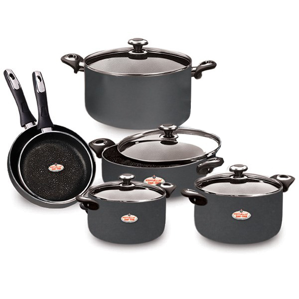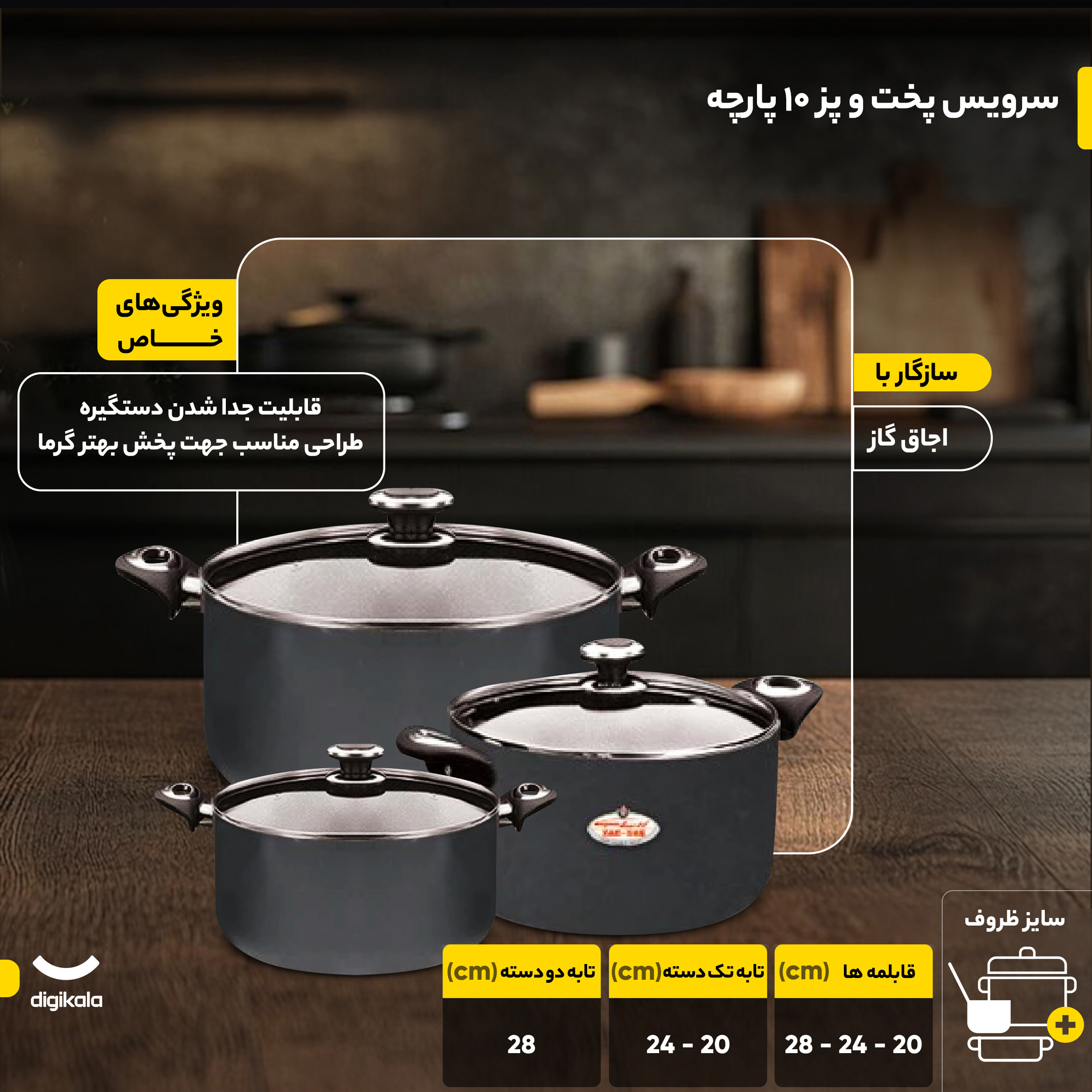 سرویس قابلمه گرانیتا مدل (GT-7500G) از شرکت زرساب است. سرویسهای آلومینیومی با وجود اینکه سالیان سال مورداستفادهی خانمهای خانه بوده، اما برای اینکه غذا بهسرعت ته میگرفت اکثراً محصول رضایت بخشی نبود. بنابراین اگر از انتقال سریع حرارت این جنس مرغوب بخواهیم بهرهی لازم را ببریم بهتر است روکشی از گرانیت را به آن اضافه کنیم تا دیگر نگران چسبیدن یا ته گرفتن غذا نباشیم. گرانیت مقاومت بسیار بالایی دارد و در این محصول از 5لایه آن برای پوشش بدنهی آلومینیومیاش استفادهشده است. همین مورد باعث شده تا به روغن کمتری نیاز داشته، و حرارت را در خود نگاه دارد. سرویس 10 پارچه گرانیتا شرکت زرساب مدل (GT-7500G) با 3 قابلمه به ابعاد 28، 24 و 20 به همراه در شیشهای، یک نیم قابلمه سایز 28 با در شیشهای و دو تابه سایز 24 و 20 به بازار عرضهشده است. جنسش از آلومینیوم و دارای روکش 5 لایه گرانیتی است و حرارت را بهطور یکسان به تمام ظرف پخش میکند. تابههای این سرویس بهصورت تک دسته طراحی شده و برای درپوش میتوان از درهای سایزهای مشابه قابلمهها استفاده کرد. دستگیرههای این سرویس از جنس باکالیت است، بنابراین مقاومت بالایی در برابر حرارت دارد. سرویس 10 پارچهی گرانیتا با برند زرساب مدل (GT-7500G) شامل 3 قابلمه، یک نیم قابلمه و 2 تابه از جنس آلومینیوم با 5 لایه روکش گرانیتی انتخاب مناسبی از محصول ایرانی باکیفیت بالا است.