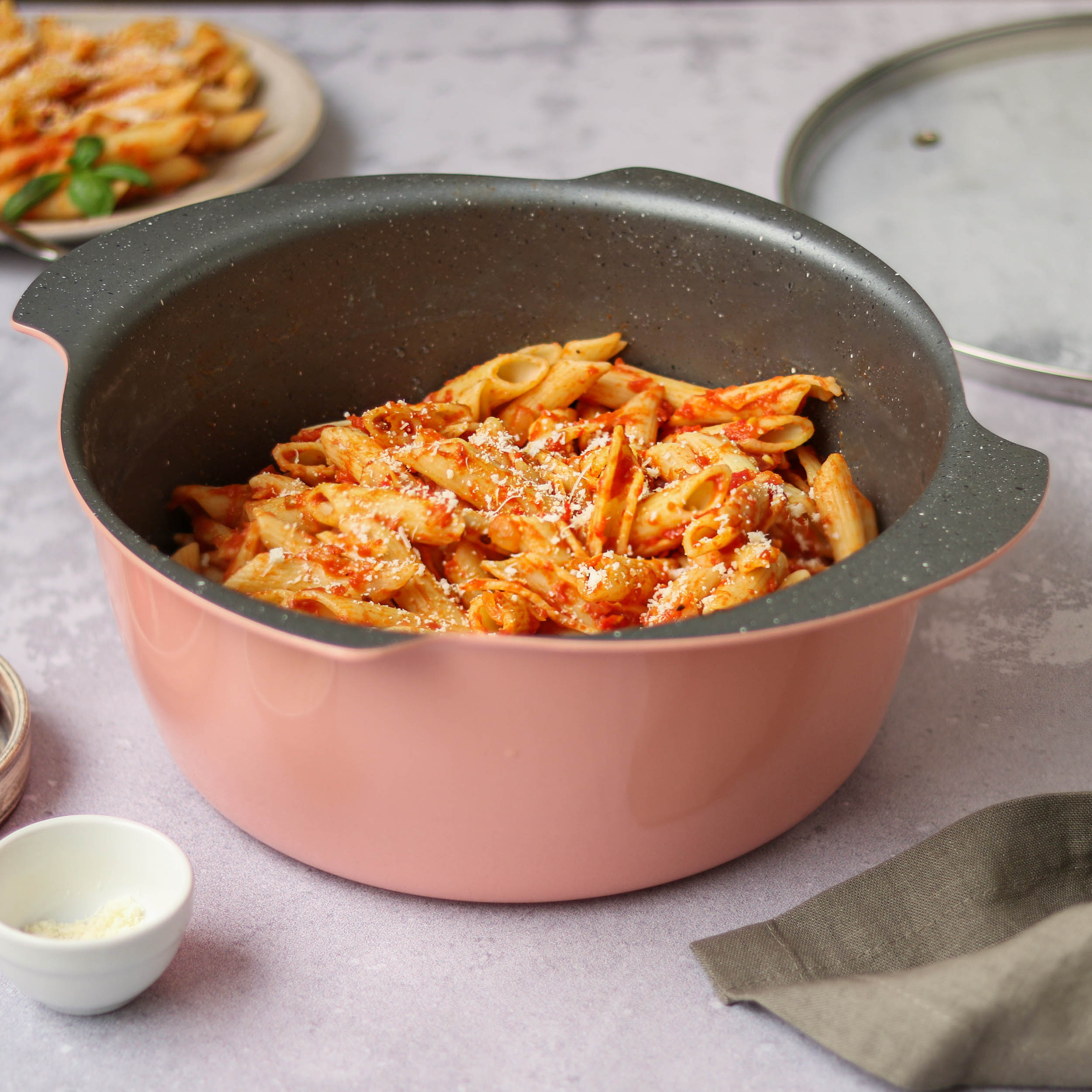 تجربه و بازخورد استفاده از این ظروف آلومینیومی با لایه داخلی گرانیت مشخص کرده است که غذاهایی که برای طبخ آنها نیاز به روغن است و یا کلا سرخ کردنی هستند، بسیار راحت از ظرف جدا شده و به هیچ عنوان به آن نمیچسبد. یکی از ویژگیهایی که این مجموعه دارد این است که برای هر یک از ظروف خود یک در با دستگیره پلاستیکی طراحی کرده و این خود نشان از اهمیت و احترام قائل شدن به حقوق مصرف کننده است. به این دلیل از دستگیره پلاستیکی در طراحی استفاده شده است که گرما و داغ بودن ظرف کمتر به دستگیرهها انتقال داده شود و در زمان استفاده دست کاربر نسوزد. از دیگر ویژگیهای بسیار مهمی که در طراحی این ظروف به کار رفته این است که هر یک از آنها دارای چهار دست گیره هستند که متصل و هم جنس بدنه بوده و به راحتی میتوان آنها را در آون ها و فر ها استفاده کرد. لازم به ذکر است که این ظروف را باید بدون درب در فر و یا آون قرار دهیم، به این دلیل که دستگیره های آن ها پلاستیکی است و امکان ذوب شدن آن ها وجود دارد. روی درهای ظروف پختوپز تکنو یک خروجی بخار قرار داده اند تا زمانی که میخواهیم آنها را در زمان پختوپز از روی ظرف برداریم، حجم بخار داخل آن برای ما خطرساز نباشد. به هیچ عنوان نباید از ظروفی که در ساخت آنها متریال فلز به کار رفته است در ماکروویوها استفاده کرد. دلیل این استفاده نکردن این است که ماکروویوها با اشعه کار می کنند و احتمال حادثه در استفاده از ظروف فلزی در آنها بسیار بالا است. در ساخت این ظروف از فلز آلومینیوم استفاده شده است.