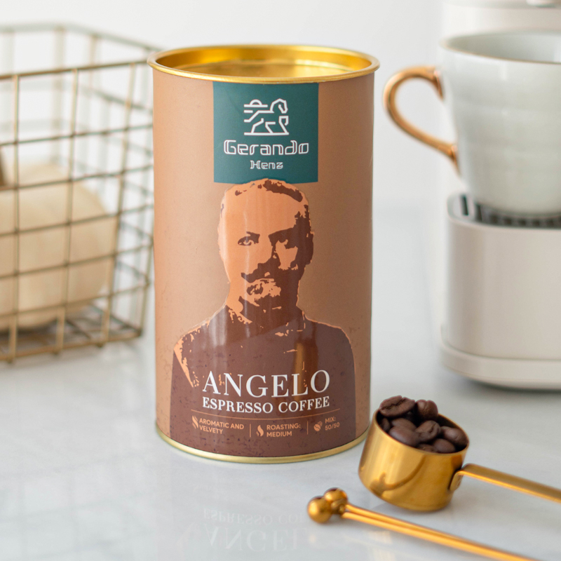 بسته بندی قهوه آنجلو: پودر قهوه داخل پاکت آلومینیومی بسته بندی شده است، سپس داخل قوطی های مقوایی که گرید غذایی دارند قرار گرفته تا از عطر و طعم محصول کاسته نشود.