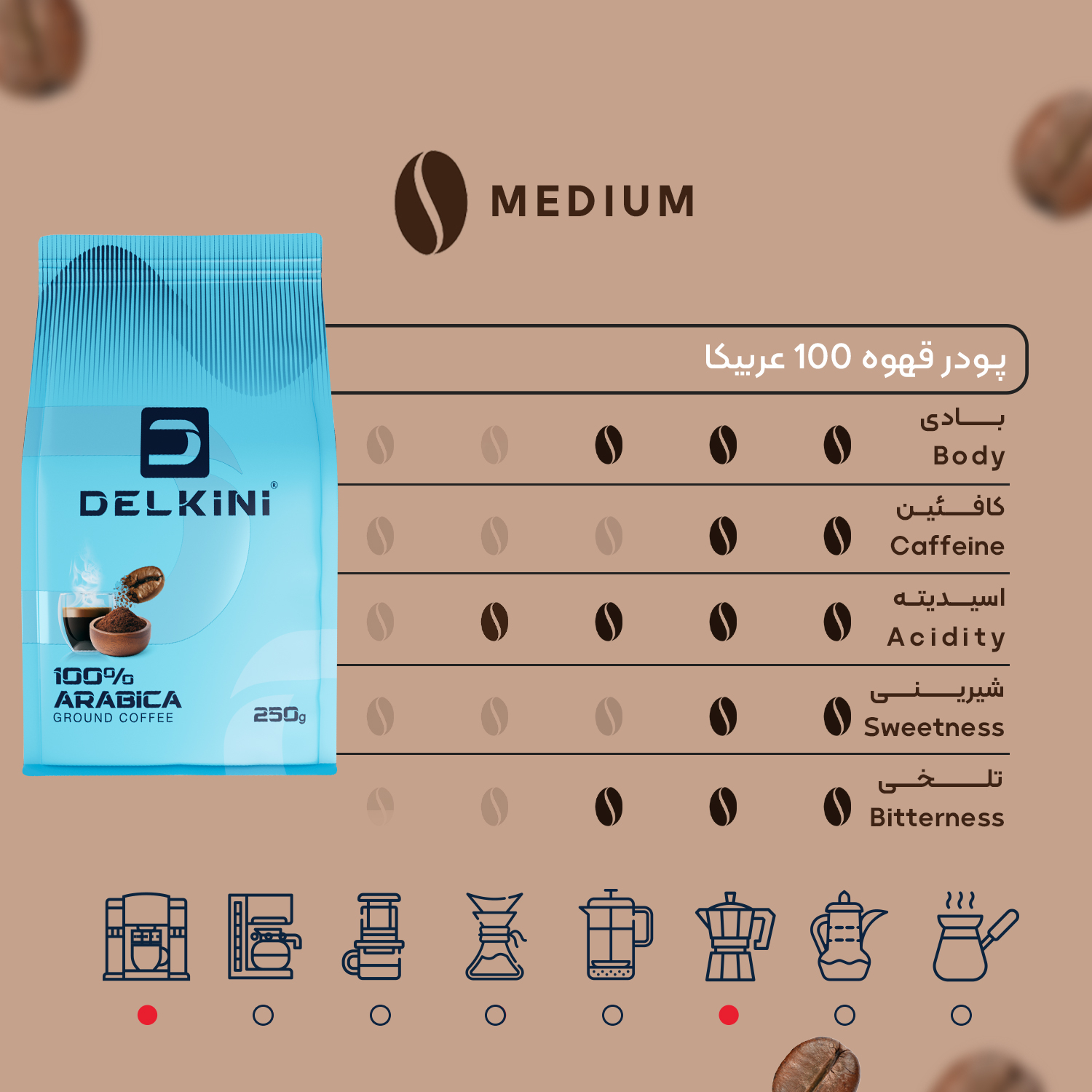 پودر قهوه 100% عربیکا دلکینی با درجه رست متوسط، ترکیبی هماهنگ از عطر و طعمهای معتدل و دلپذیر را به فنجان شما میبخشد. تلخی این قهوه آرام است و کمتر از دیگر پودرهای قهوه، اما با شیرینی ملایم و اسیدیته بالا، تجربهای متفاوت و لذتبخش از قهوه را برای شما فراهم میکند.