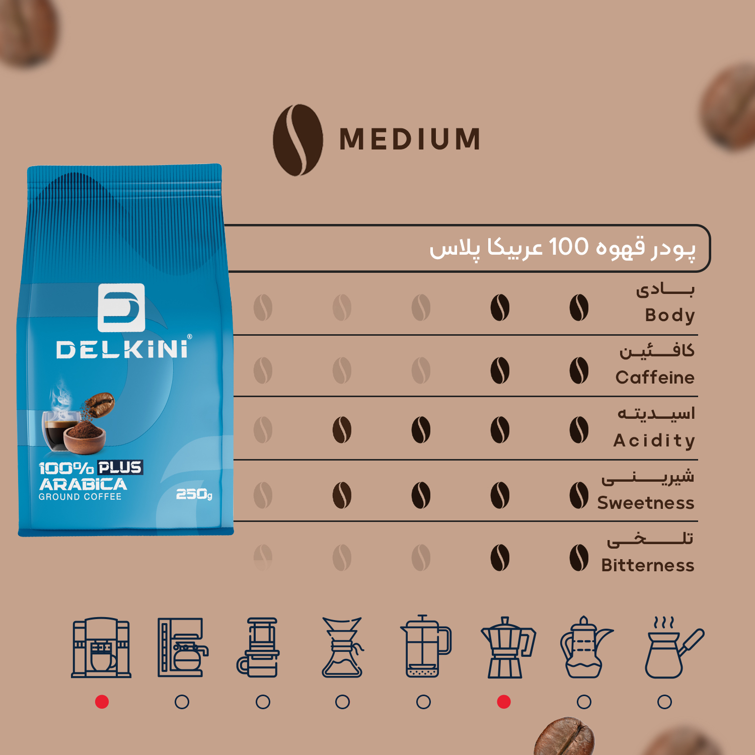 این پودرهای اعجابانگیز را میتوان با استفاده از ابزارهای مختلفی نظیر دستگاه اسپرسو، قهوهساز دمی یا چکهای، اروپرس، کمکس، فرنچ پرس، موکاپات، دله عربی و جذوه تهیه کرد. هر کدام از این روشها قادر به آشکارسازی جنبههای منحصر به فردی از پودر قهوه 100% عربیکا پلاس دلکینی هستند و به شما این امکان را میدهند که با هر جرعه، به یک قصهی نو و جذاب بپردازید.